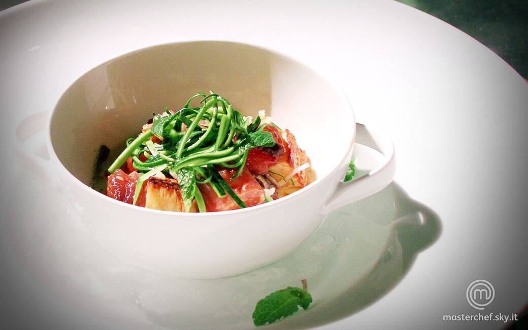 Pelare le zucchine con un pelapatate, tagliare la buccia a strisce sottili e conservarla in acqua e ghiaccio. Tagliare la polpa a cubetti, scottarla in una padella con olio evo fino a farla arrostire e tuffarla in una soluzione di 90 ml di acqua e 20 grammi di sale.