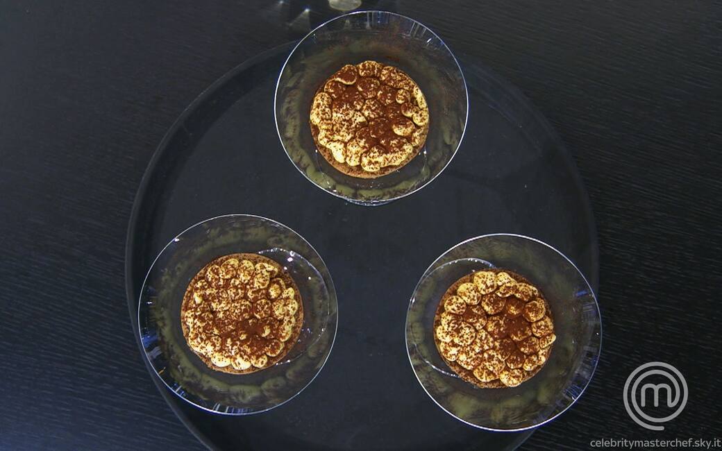 Con una sac a poche riempire il fondo di una coppa martini con della crema di mascarpone. appoggiare un biscotto a mezza altezza della coppa in modo che rimanga “sospeso” sopra la crema di mascarpone. distribuirvi sopra uno strato di crema di mascarpone e completare spolverando poco cacao.