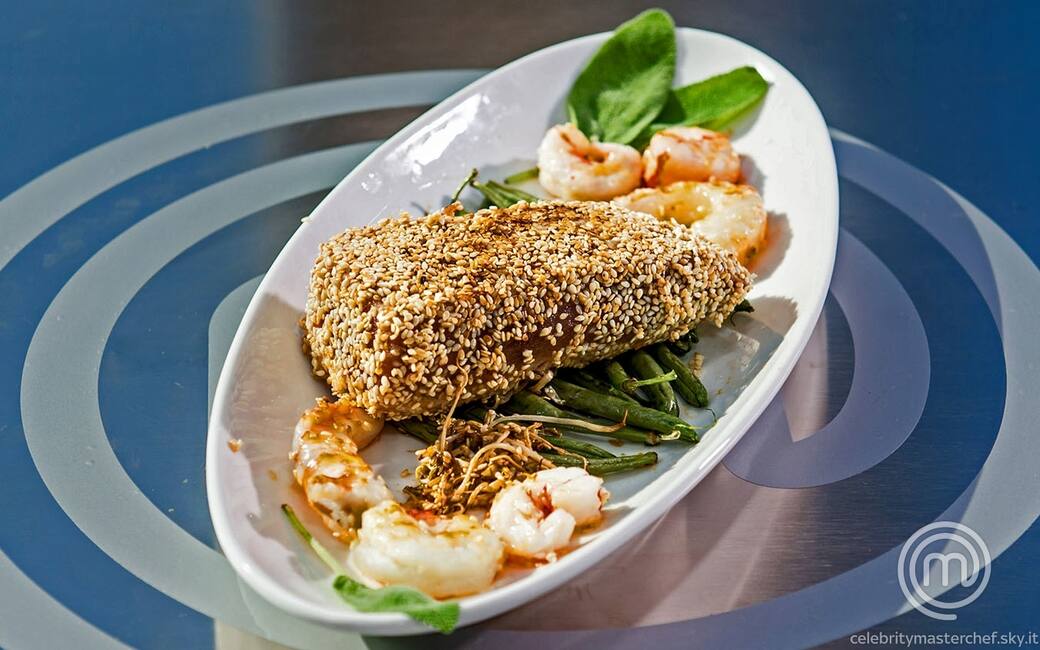Tonno abbronzato in semini di sesamo con fagiolini soffritti nella soia, gamberi e scampi