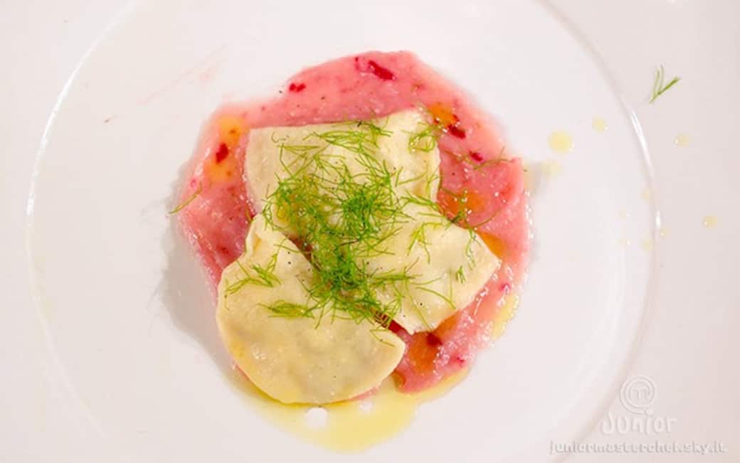Tortelli alla gallinella con salsa di patate, barbabietola e finocchio