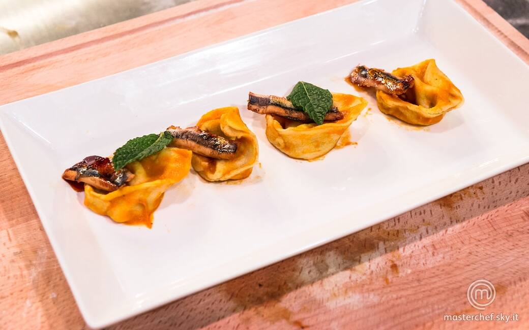 Portare a ebollizione l’acqua in una pentola e lessare i tortelli in acqua salata. Nel frattempo, versare lo zucchero in una padella antiaderente e creare il caramello. Cuocere le alici per un minuto nel caramello dalla parte della pelle e tenere da parte.