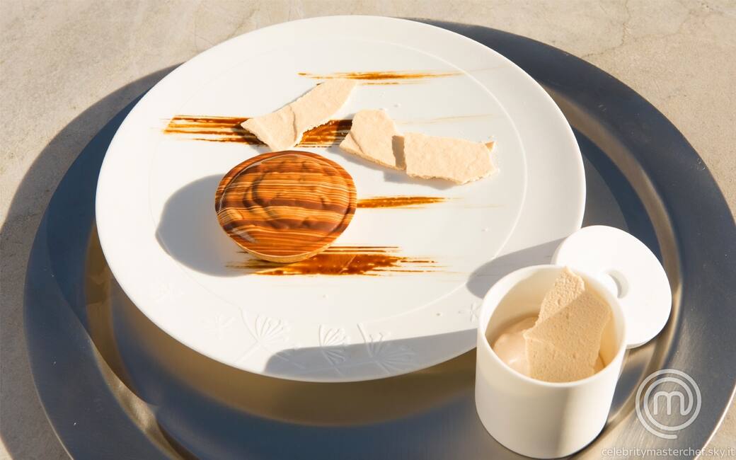 Preparare la mousse al cioccolato caldo: affumicare il cioccolato per un’ora, poi farlo sciogliere con 40 g di burro, portandolo a 35 °c. preparare uno zabaione con 80 g di tuorli e 12 g di zucchero semolato. mescolare lo zabaione con il cioccolato affumicato. montare 200 g di albumi con 70 g di zucchero semolato, quindi incorporare delicatamente lo zabaione al cioccolato. tenere da parte a temperatura ambiente.