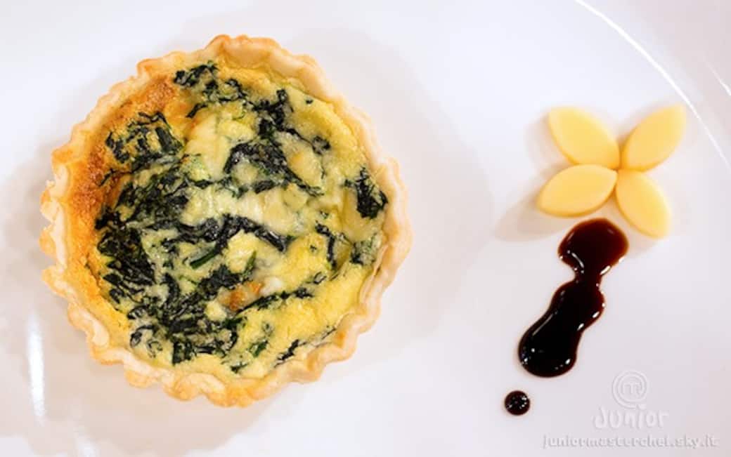 0}sbollentare gli spinaci per 10 minuti circa. scolarli e strizzarli bene. stendere la pasta sfoglia in una teglia di diametro di circa 26 cm, bucherellarla con una forchetta e mettervi gli spinaci, la scamorza e l’edamer a dadini. in una ciotola sbattere le uova con il parmigiano, la panna , l’erba cipollina e un pizzico di sale. versare nella teglia e infornare a 200° per 20 min circa.