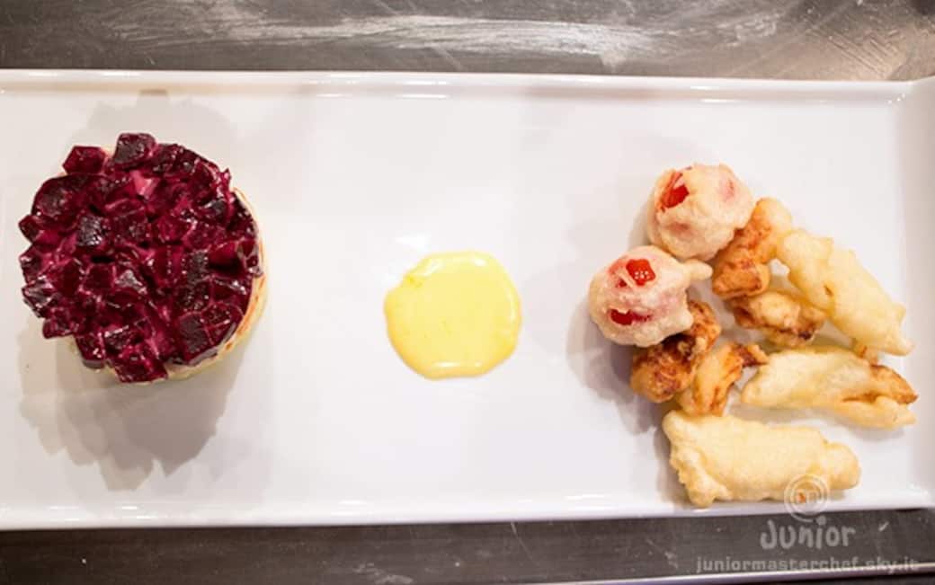 Comporre il tortino con l’aiuto di un coppa pasta, inserendo prima le patate condite con la maionese, poi la giardiniera, la cipolla e in ultimo le barbabietole, alternando i quattro strati.