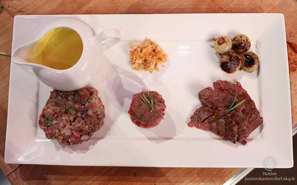 Impiattare in un piatto rettangolare disponendo la tartare di kobe nella parte sinistra del piatto servita con l'emulsione di agrumi. nella parte centrale del piatto posizionare la tagliata di kobe e in una cocotte davanti le cipolline in agrodolce. nella parte destra ultimare il piatto con medaglioni uno sull'altra e in una cocotte davanti servire la purea di patate con erbe aromatiche.