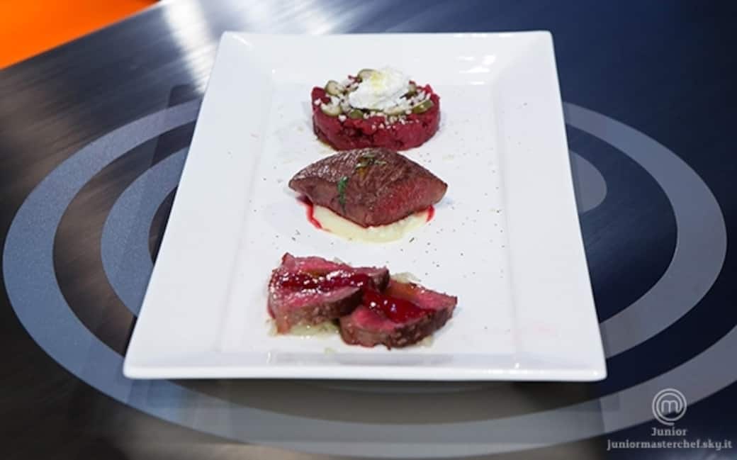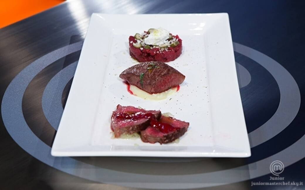Iniziare ad impiattare in un piatto rettangolare, disponendo a sinistra la tartare di cervo con sopra la cnel di ricotta, i capperi e il cruble di panko. al centro impiattare la crema di patate e adagiarvi sopra il cervo. a sinistra mettere la tagliata di cervo con del rabarbaro e la salsa ai lamponi.
