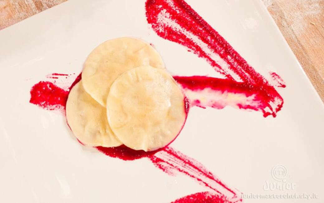 Bollire una patata di medie dimensioni e metterla ad asciugare su un piatto. in un altro pentolino far bollire in acqua salata, un finocchio tagliato in due, finche non risulti completamente morbido. scolare il finocchio e nella stessa acqua mettere a scaldare leggermente una barbabietola. frullare il finocchio, la barbabietola, 2 cetriolini, sale, pepe, q.b. di brodo di gallina, fino ad ottenere un impasto cremoso che servira per decorare il piatto e condire i ravioli.