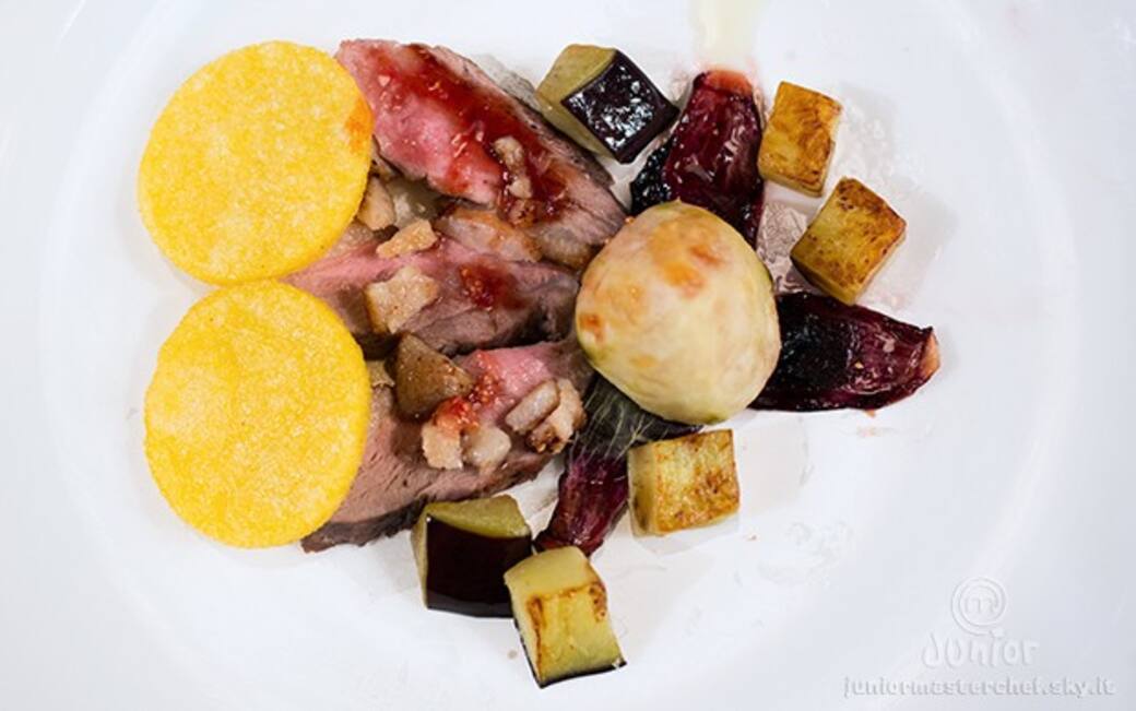 Adagiare la carne a ventaglio al centro del piatto e versare il sughetto fra una fetta e l’altra. aggiungere un fico a stella (con la buccia aperta), il tortino di melanzane e le chips di polenta fra una fetta e l’altra della carne