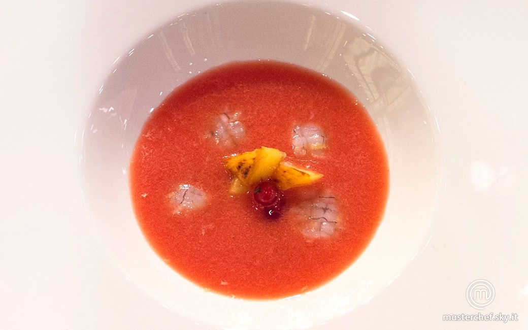 Impiattare disponendo le cicale di mare sul fondo del piatto, ricoprire col gazpacho e guarnire con l’ananas caramellato e qualche ribes.