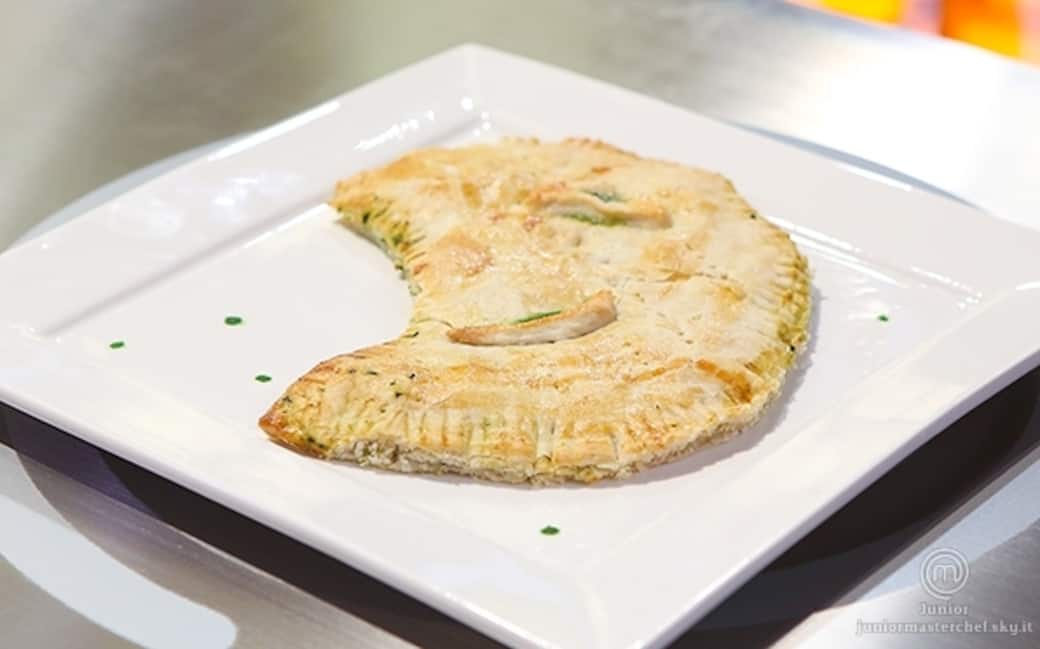 Distendere la pasta sfoglia su una carta da forno, inserire solo su una meta della sfolglia il ripieno precedentemente preparato disegnando una mezza luna; ricoprirlo con l'altra meta e ritagliare i bordi formando una mezza luna. a questo punto chiudere bene i bordi con una forchetta.