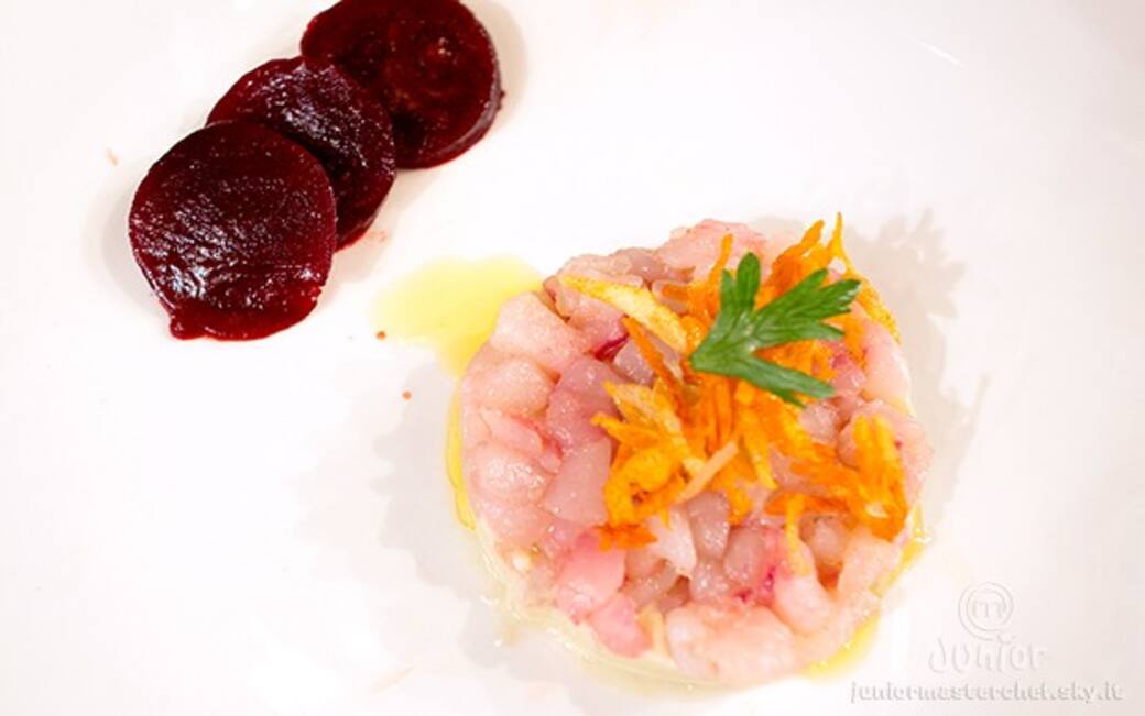 Preparare un’emulsione di aceto di vino, aceto balsamico e un’aggiunta di olio a filo e mettervi a marinare per 10 minuti la barbabietola tagliata a fettine sottili. tagliare la mostarda gialla a quadratini piccoli, togliere la barbabietola dall’aceto e tagliarla in piccole forme tonde.