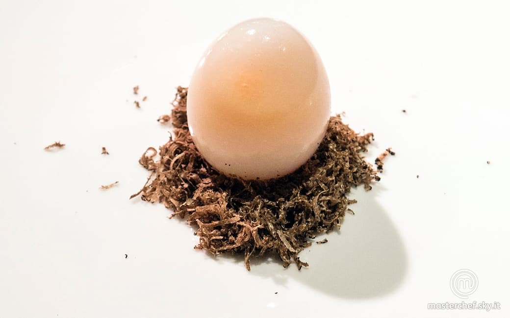 Assemblare il piatto creando un nido di tartufo nero e posizionando l’uovo cotto privato della buccia. Completare con qualche fiocco di sale Maldon.