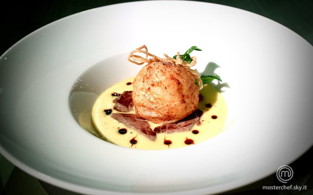 Impiattare versando uno specchio di salsa Mornay. Disporre l’uovo fondente al centro, la cialda di pasta fritta e la foglia di basilico fritta. Aggiustare di sale e pepe e completare con qualche goccia di aceto balsamico.