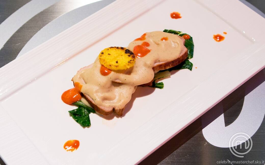 Distribuire le bietole in 4 piatti rettangolari, creando una striscia, e spalmarvi sopra un velo di salsa tonnata. adagiare sulla salsa 3-4 fettine di carne e ricoprirle con altra salsa. completare con gocce di maionese di gamberi e un dischetto di polenta.