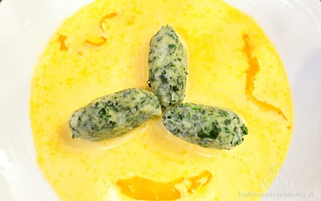 Lessare gli spinaci, strizzarli bene e lasciarli raffreddare, poi tritarli con il coltello. in una boule impastarli con la ricotta, la farina, il parmigiano, un uovo, sale, pepe e noce moscata. far bollire dell’acqua salata, formare le quenelle con l’aiuto di due cucchiai e tuffarle direttamente nell’acqua, scolarle quando risalgono in superficie.
