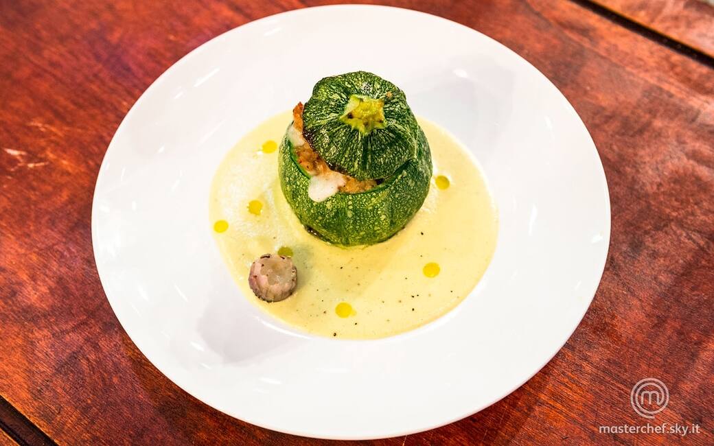 Impiattare disponendo la salsa sul fondo. qualche goccia di olio evo, una spolverata di pepe e la zucchina ripiena.