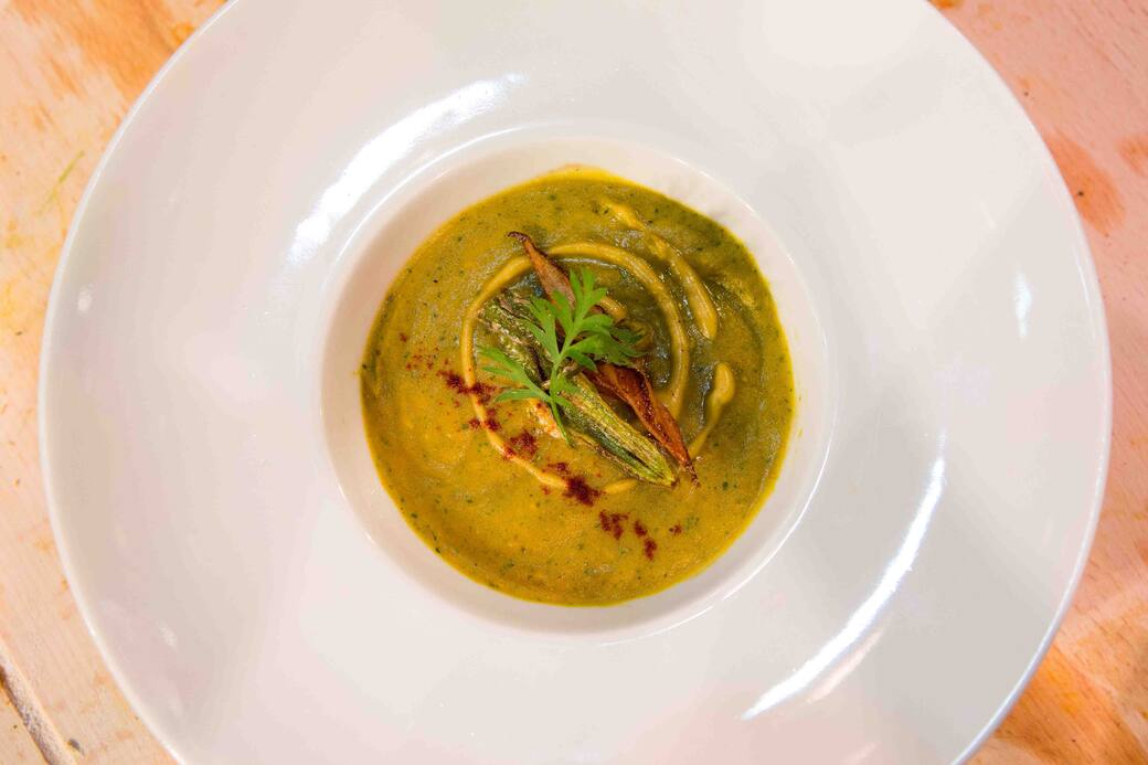 Versare la crema di zucca nelle fondine e decorare con una spirale di crema di avocado. Aggiungere qualche losanga di friggitello, qualche anello di cipolla fritta e completare con altra paprika, guarnendo con il ciuffo verde di una carota.