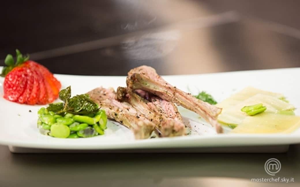 In un piatto rettangolare creare con un coppa-pasta un piccolo tortino di fave e adagiarvi sopra alcune foglie di menta fritta. Posizionare al centro del piatto tre costolette di agnello e versare sopra un cucchiaio di crema di fave. Adagiarvi tre fettine di pecorino scottato, quindi condire l'agnello con del pepe nero tritato al momento. Tagliare la fragola a fette per finire di decorare il piatto. Servire ben caldo.