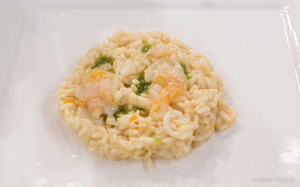 Rosolare il riso in una casseruola con lo scalogno, sfumarlo con il fumetto di pesce e portarlo a cottura alternando un mestolo di infuso di lemongrass e un mestolo di brodo di crostacei. Quando mancano 5 minuti circa alla fine della cottura aggiungere le capesante e le seppioline tagliate a julienne. Mantecare con olio e un cucchiaio di succo di pompelmo.