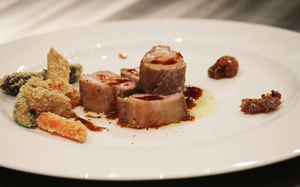 Servire due o tre fette piuttosto spesse di lombata di agnello glassandole con la salsa allo sherry e accompagnandole con le verdure sabbiate.