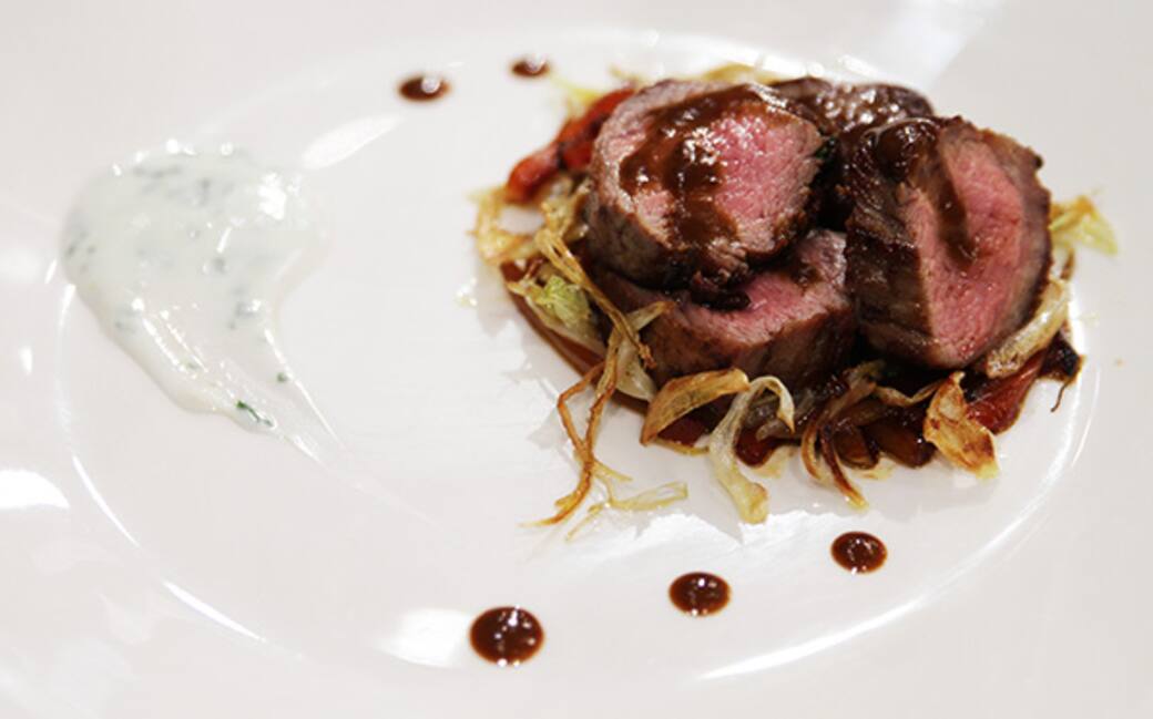 Tagliare il lombo ottenendo dei medaglioni, servirne due per piatto accompagnandoli con la salsa alla senape e i peperoni caramellati al balsamico.