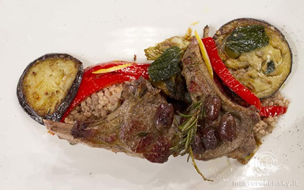 Portare a cottura la fregola. Nel frattempo, saltare in padella i peperoni. A cottura quasi ultimata, aggiungere le olive taggiasche e qualche scorzetta di limone. A parte saltare le melanzane a fette con olio abbondante.