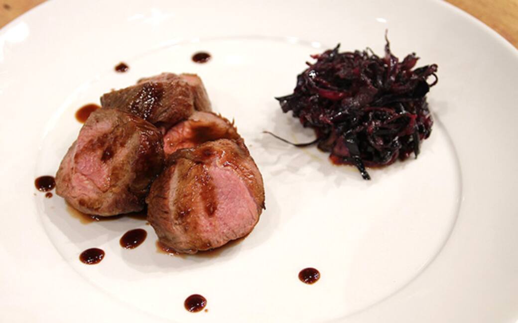 Togliere le lombate dalla padella e tenerle al caldo. Sgrassare il fondo di cottura e sfumarlo con aceto balsamico e un goccio d’acqua. Aggiungere l’uvetta, il timo e la fetta di lardo e cuocere il tutto per due minuti fino ad ottenere una salsa ristretta.