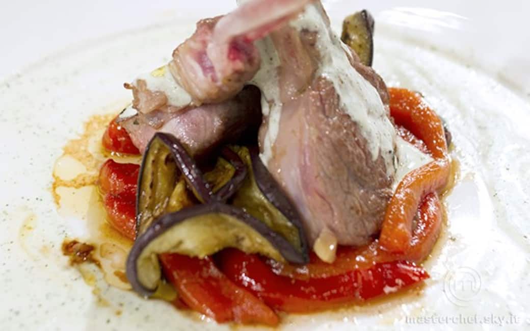 Infilare ai lati delle costolette due fette di melanzane grigliate chiuse a fiore.