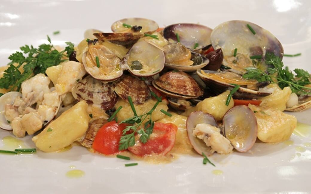 In un’altra padella fare aprire le vongole. Scolare le patate, passarle nello schiacciapatate e farle raffreddare. Unire la farina, le uova s.q. e il sale. Impastare e formare degli gnocchi.