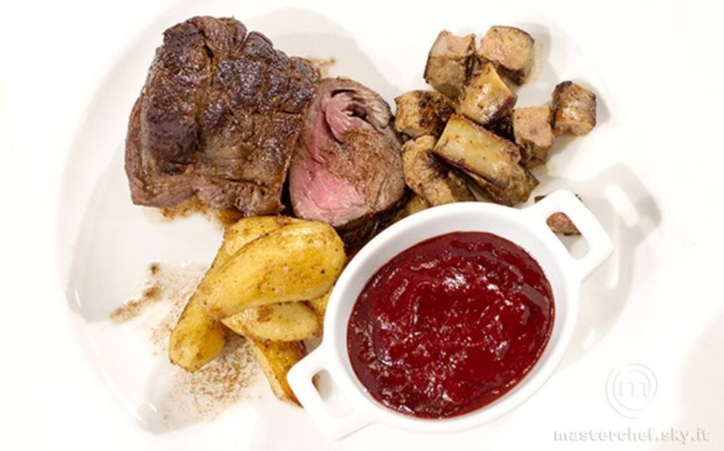 Legare con dello spago il filetto per dargli una forma cilindrica. Caramellare e sigillare la carne nel burro per 2 minuti e passarla nel forno a 220° per altri 6 minuti. Toglierla e farla riposare coperta con della stagnola.