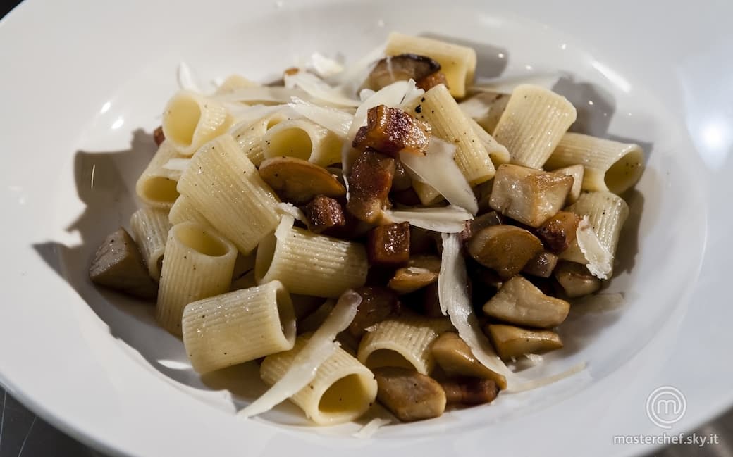 In una pentola d’acqua portata a bollore far cuocere le mezze maniche. Quando la pasta è pronta scolarla e aggiungerla ai cardoncelli. Aggiungere il guanciale.