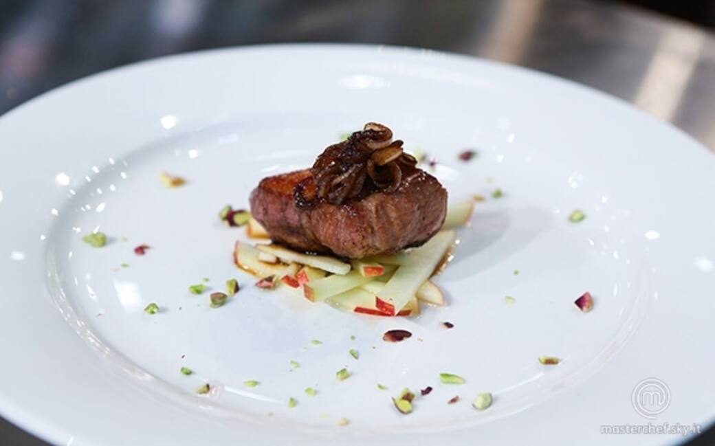 Tagliare la mela a fiammiferi e immergere in acqua e limone per mantenere il colore. Tagliare a fettine il cipolloto, farlo appassire in padella con un filo d'olio e poi sfumare con aceto balsamico.