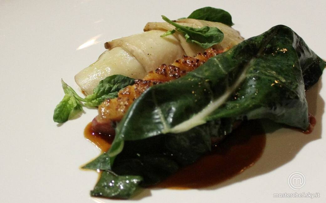 Impiattare posizionando una fetta di anatra con un cucchiaio della sua salsa. Di fianco aggiungere lo scampo crudo coperto con le fettine di fungo. Completare con la salsa di scampi.