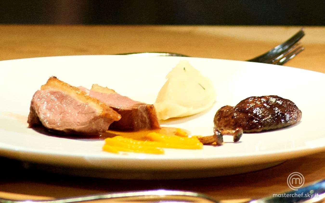 Disporre una quenelle di patate nel piatto, adagiaci sopra 2 fette di anatra, la purea di carote con l’aiuto di una sac-à-poche, un pezzo di porcini e 2 pioppini. Aggiustare di sale ed aggiungere il fondo d’anatra.