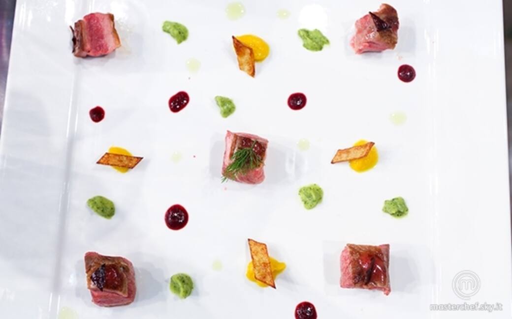 Tagliare il petto dell'anatra a cubetti regolari di circa 4 centimetri per lato e disporli a piacere sul piatto alternando alle gocce di purea di verdura cotte a vapore e delle gocce di succo di ribes e di mora alternando i colori. Aggiungere sopra ad ogni quadrato di petto di anatra una buccia di mela fritta e una buccia di patata fritta. Aggiungere per decorazione qualche foglia di aneto.