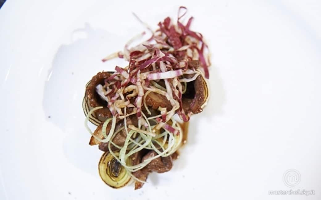 Tagliare finemente il porro e metterlo in acqua e ghiaccio. Sfogliare il radicchio e condire con aceto balsamico.