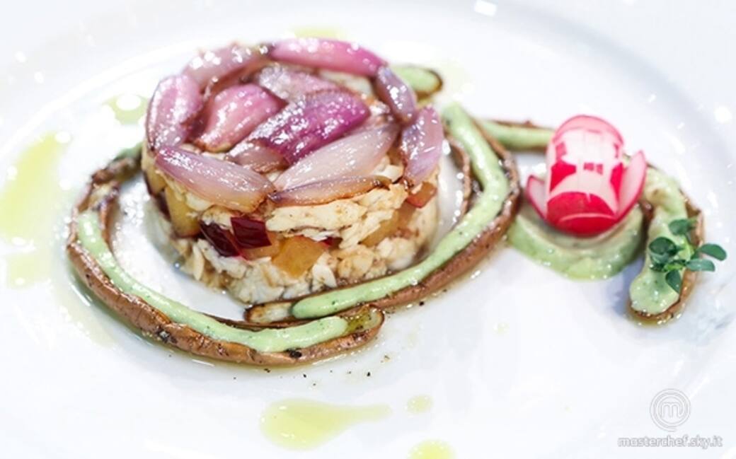 Impiattare con coppapasta: mettere l'anguilla, le prugne e finire con lo scalogno sfogliato. Coprire con le melanzane. Decorare il piatto con un filo di crescenza e il rapanello.