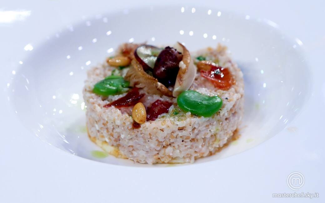 Unire in un wok il farro, il latte allo scalogno, lo speck, l'uva, i pinoli e i funghi, mantecando il tutto con il castelmagno. Sbollentare le fave e il prezzemolo. Frullare un cucchiaio di pinoli tostati con olio e prezzemolo, per ricavarne un olio profumato.