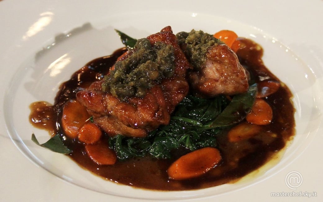 Mettere gli spinaci alla base del piatto e intorno le carote, appoggiare con un cucchiaio le animelle sugli spinaci. Versare la salsa di vitello. Finire con gocce di salsa agrodolce sul piatto.
