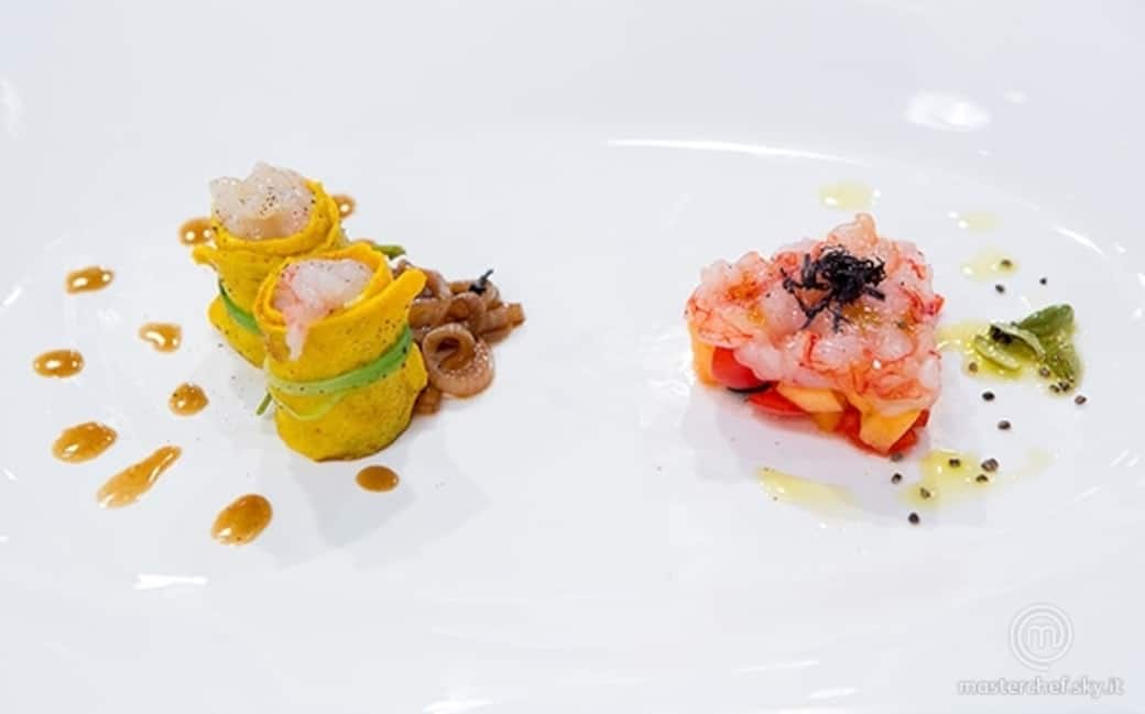 Impiattare seguendo quest'ordine: con un coppa pasta mettere alla base un cucchiaio di dadolata di melone creando il primo strato. Il secondo strato è composto dall’insalata di pomodorini, il terzo da tartare di gamberi rossi; rifinire con un filo d'olio al cardamomo. La parte fin qui composta è l’antipasto d’estate, ora procedere con la composizione di quello invernale. Prendere un cucchiaino di cipollotti rossi caramellati e appoggiarlo sul piatto facendo una leggera striscia con il fondo del cucchiaio, poi adagiare il cilindro di frittata e gli scampi conditi.