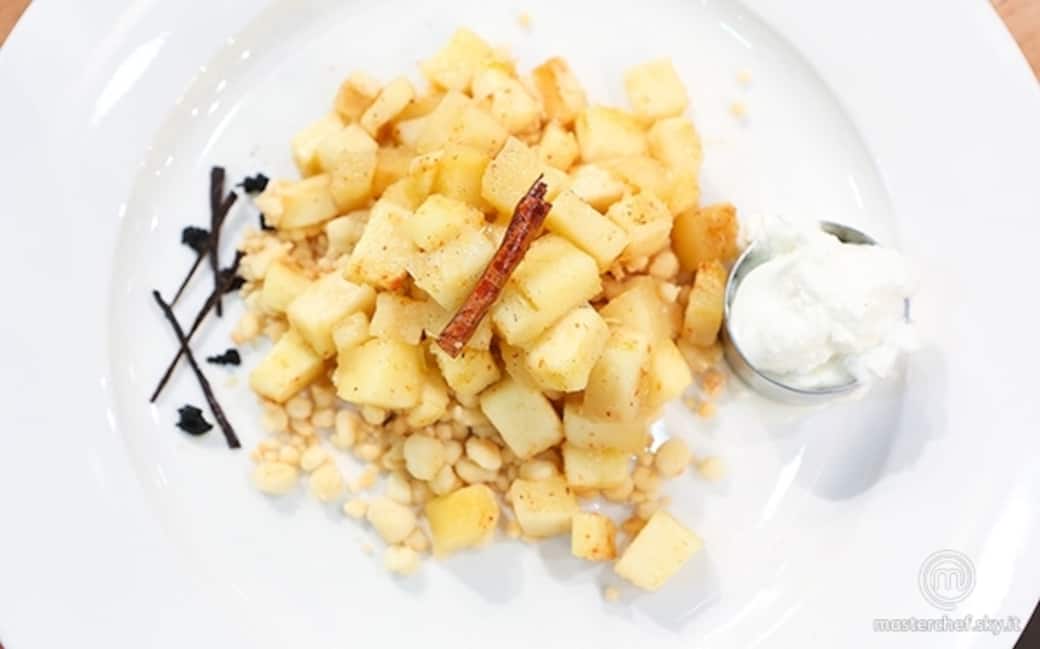 Alla fine, in un coppa pasta, adagiare sul fondo il crumble e sopra le mele. Decorare con dei baccelli di vaniglia. Servire accanto la panna.