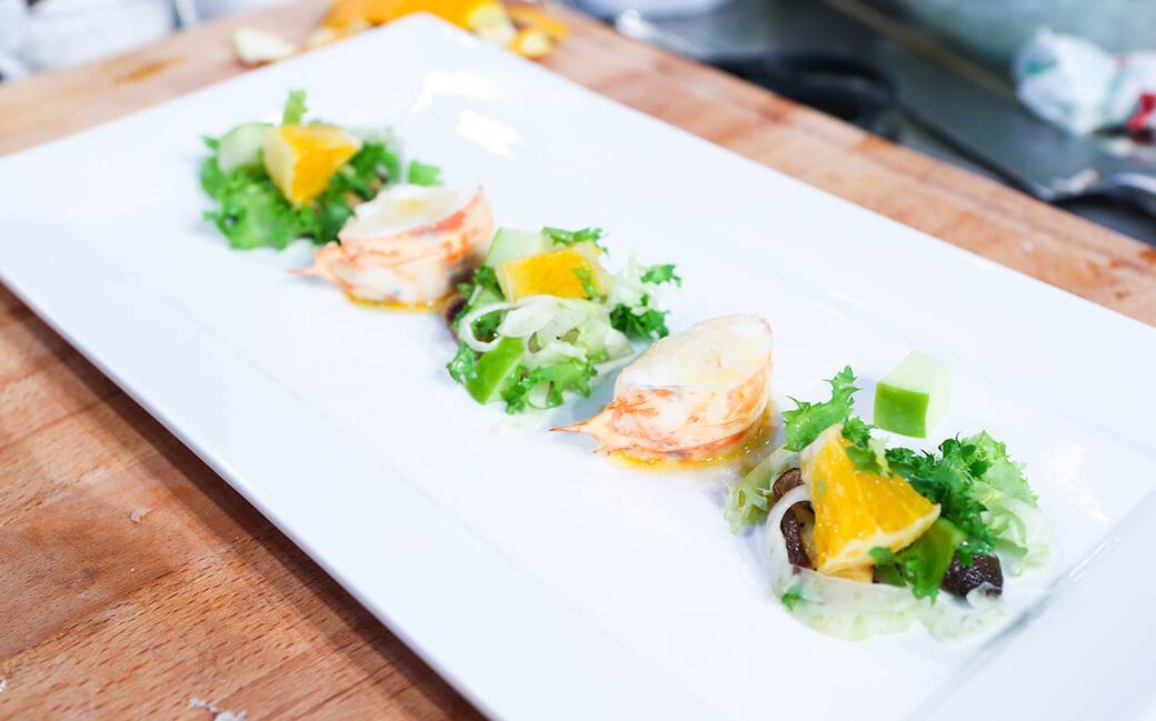 Disporre dei funghi come base, adagiarvi sopra un pugno di insalatina riccia e finocchio con un pezzetto di arancia e di mele. Affianco adagiare un pezzo di aragosta e versarvi sopra la salsa ottenuta con il miele e l'interno della testa dell'aragosta. Ripetere alternando l'aragosta e l'insalata con l'arancia.