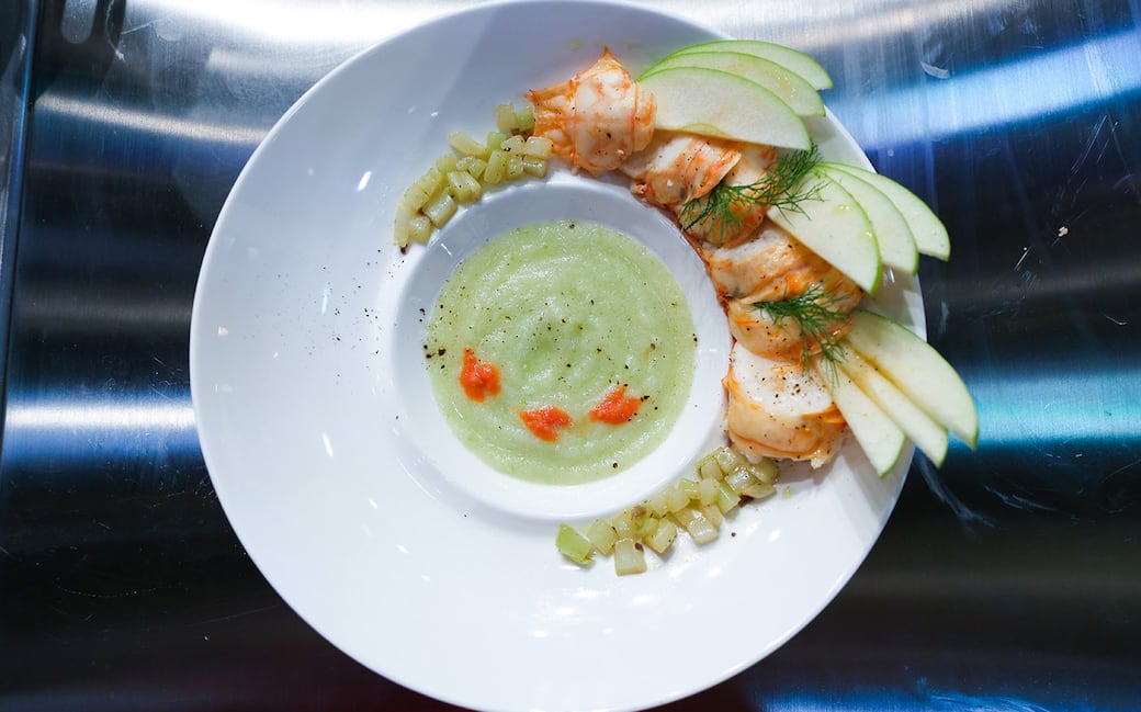 Impiattare in una fondina il centrifugato e adagiare sul bordo del piatto l'aragosta tagliata contornata dalla dadolata di finocchi, da qualche fetta di mela e qualche filo di barba di finocchio.