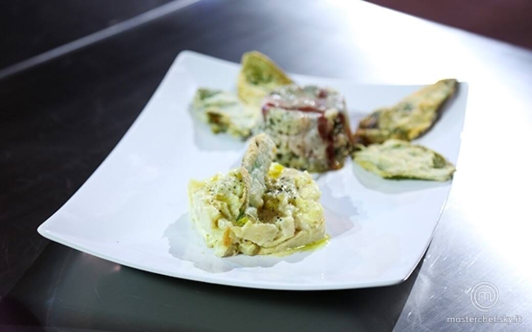 Sformare la terrina, a fianco comporre il tortino di patate usando un coppa pasta e condire con sale di Cipro macinato al momento. Decorare il piatto con le foglie di salvia fritte.