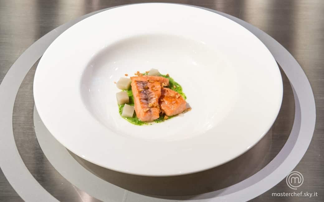 Impiattare versando un cucchiaio di crema alle foglie di rapa, posizionando il filetto di trota, i cubetti di topinambur e l’aglio affumicato. Completare il piatto con qualche fiocco di sale Maldon.