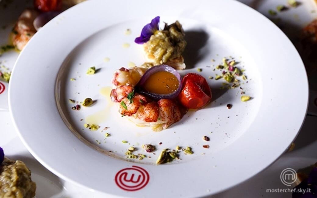 Astice al vapore con frutto della passione, pomodorini canditi e caviale di melanzana