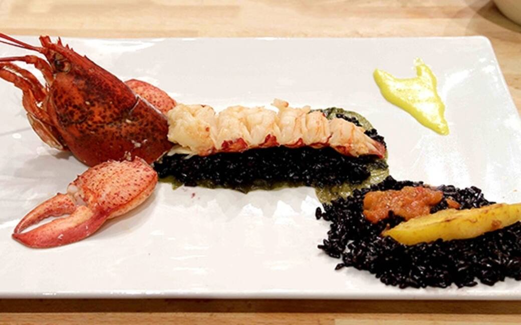 Stendere l'alga sul piatto, posare sopra il riso e il filetto di astice, condire con il succo della testa e delle zampe. Sgusciare le chele e posizionarle sul piatto. A parte fare un tortino di riso venere condito con la fruttata di pomodoro e il mango fritto. In un angolo mettere col cucchiaio la maionese allo zenzero.