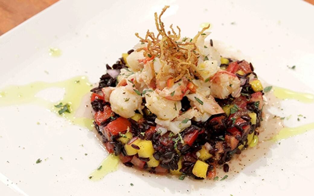 Amalgamare il riso con la cipolla, il peperoncino, il mango e i pomodori. Condire con olio, sale e pepe. Versare il composto nel coppapasta, rimuoverlo e adagiarvi le rondelle di astice. Guarnire con i fiammiferi di zenzero e qualche fogliolina di menta fresca.