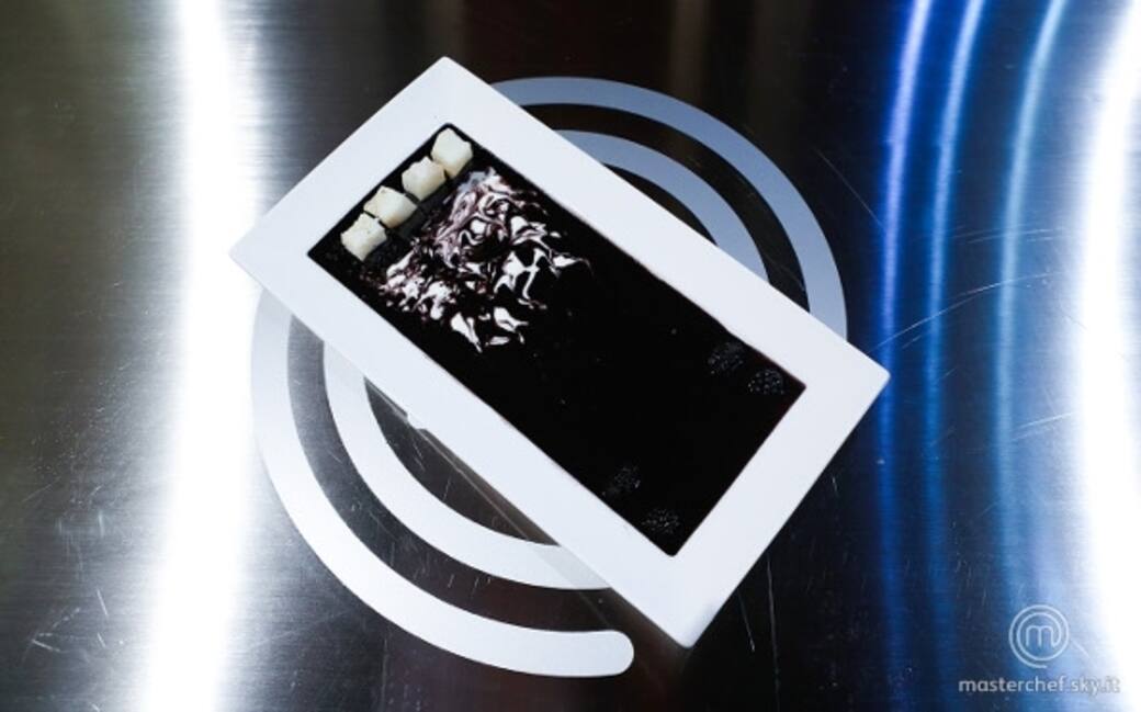 Usare un piatto piano rettangolare di circa 15 cm per 25 dal bordo largo e versare la crema nera a specchio coprendo tutto il fondo. Da un lato versare un po' di yogurt al cocco e decorarlo a piacere. Adagiare 4 quadrati di pane, cospargerli di cioccolato grattugiato e coprirli con i cubi di pesce. Negli angoli opposti fare due quenelle di caviale e tagliare le more della stessa misura adagiandole vicine al caviale.