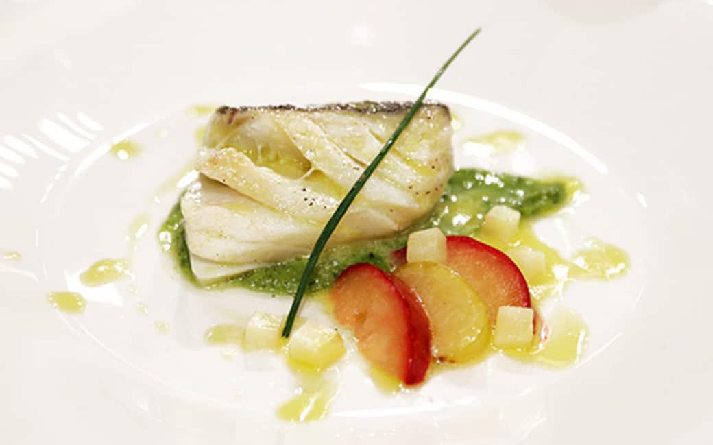 Impiattare ponendo sul fondo un po’ di crema di zucchine, adagiare il baccalà, irrorare con il suo fondo di cottura e decorare con le patate, le prugne a spicchi, l’erba cipollina ed un filo d’olio.